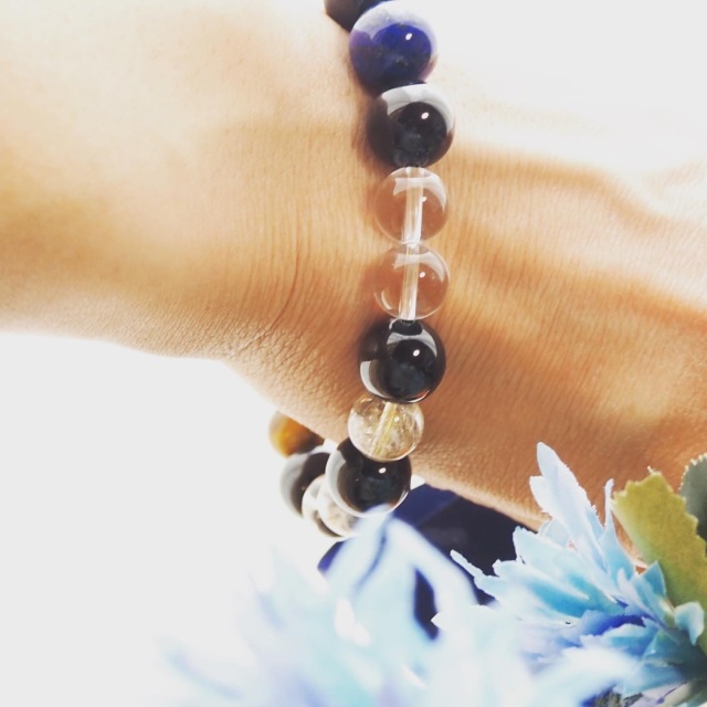 ハイパーシーン直径約12mm×8石・ラピスラズリ直径約12mm×1石・タイガーズアイ・アイアゲート・ルチルクォーツ・直径約10mm×各1石・クリスタル直径約10mm×8石・内周約19cm・シリコンゴム製