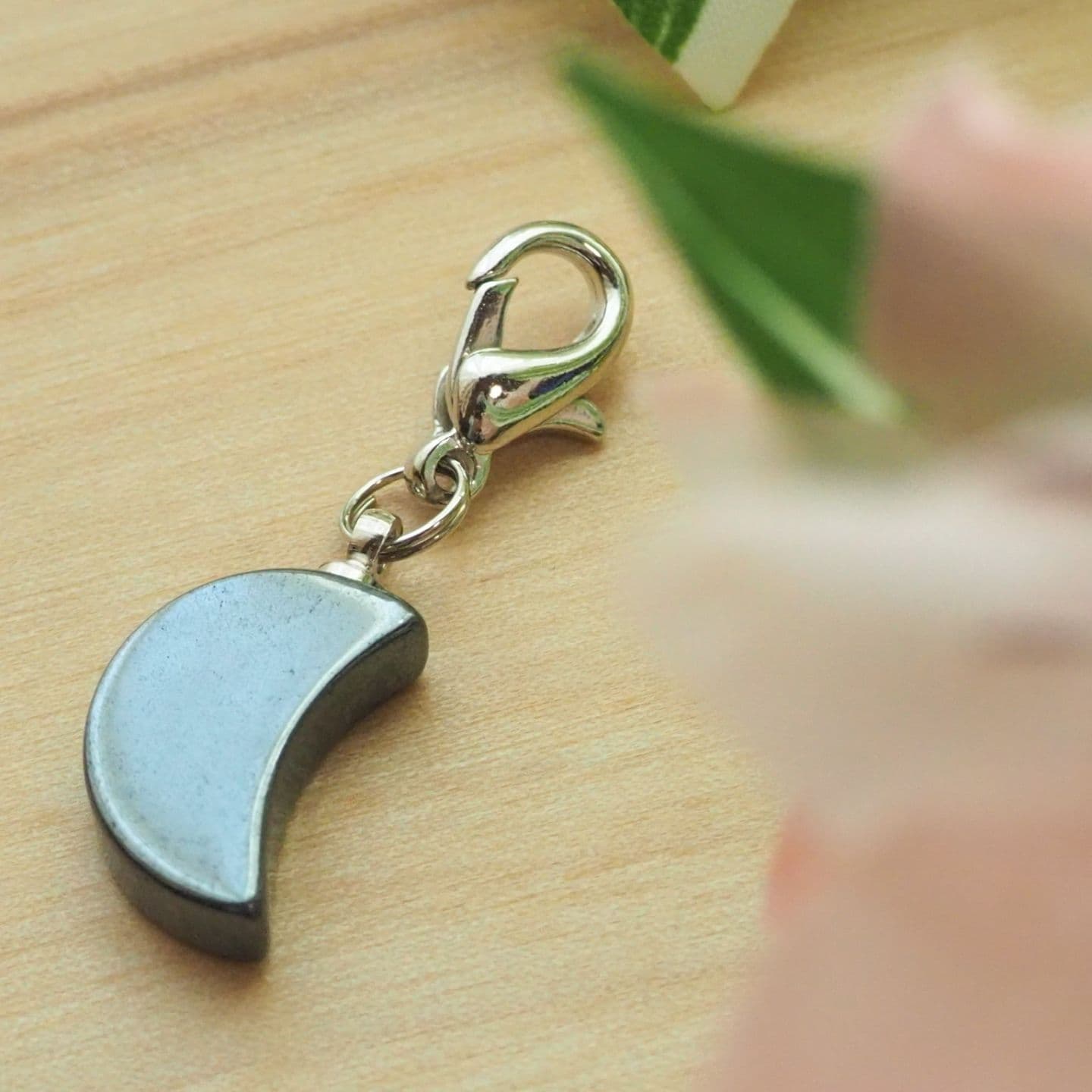 「魔を払い、勝利を呼ぶ石」ヘマタイトをハーフムーン仕様にしたマスクチャームです。